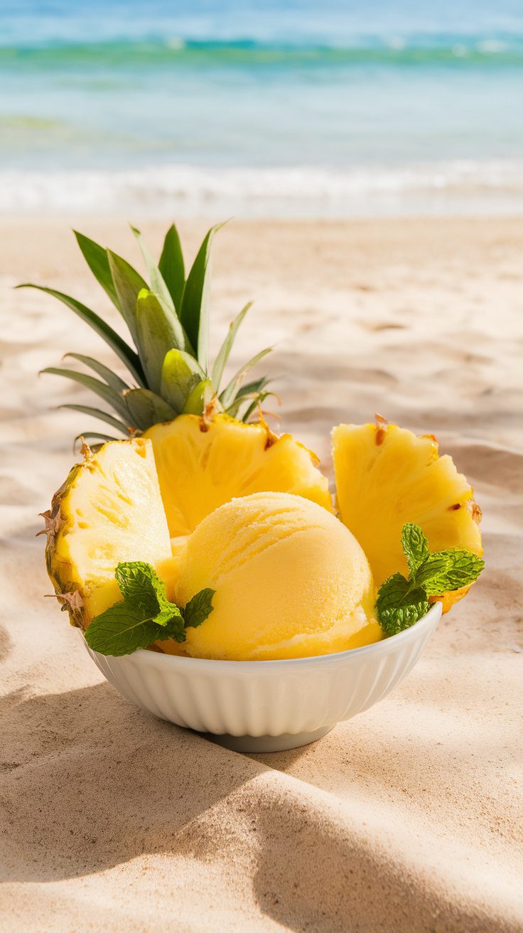 A bowl of pineapple sorbet with fresh pineapple slices and mint leaves on a sandy beach.