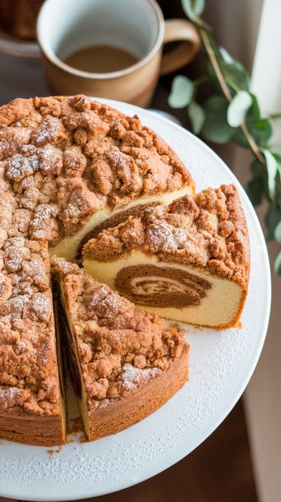 It’s a tender, buttery cake with a cinnamon-sugar swirl running through the middle and a crumbly streusel topping that’s pure magic.