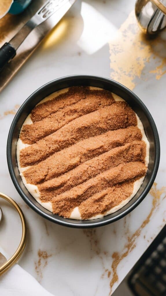 In a bowl, combine the flour, brown sugar, and cinnamon for the topping. Use your fingers or a pastry cutter to mix in the cold butter until crumbly. Sprinkle it evenly over the top of the cake.