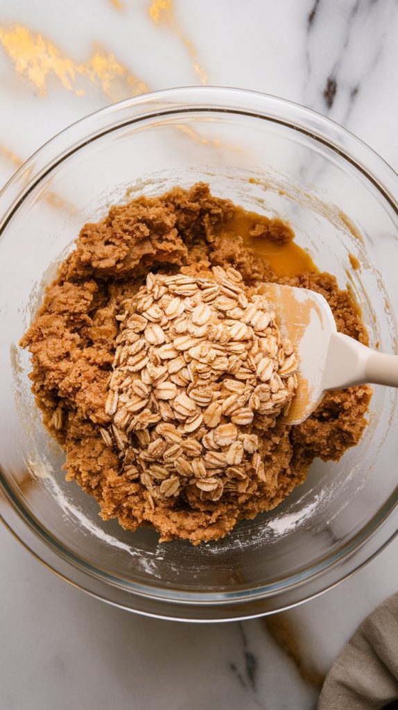 Slowly add dry ingredients to the wet mixture, mixing just until combined. Stir in 3 cups rolled oats with a spatula.