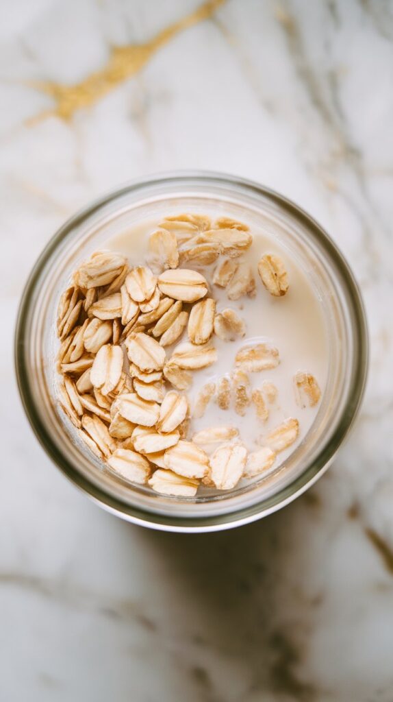In a mixing bowl or jar, add 1 cup rolled oats and 1 cup unsweetened almond milk. Stir together to begin softening the oats.