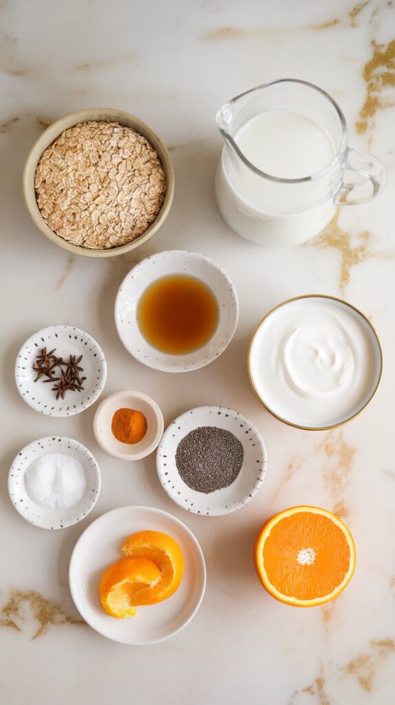 Oats soak up the almond milk and yogurt overnight, softening into a perfect creamy texture without cooking. The chia seeds swell up and add a pudding-like body. Orange zest gives you bold citrus flavor without adding liquid. Ground clove is powerful and a little goes a long way — it warms up the whole mix. Greek yogurt adds protein and tang to balance the sweet maple syrup.