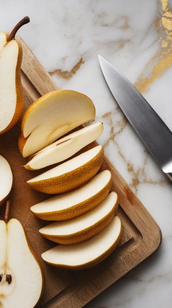 Thinly slice 1 large ripe pear into half-moon shapes. Don’t peel it.