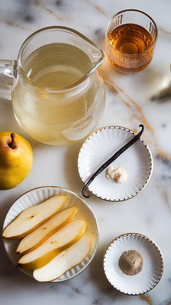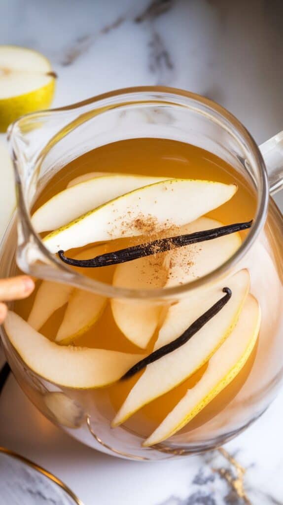 In a large glass pitcher, combine 1 1/2 cups cold pear nectar, scraped vanilla bean seeds, the scraped pod, 1/8 tsp ground nutmeg, and the sliced pear. Stir gently.