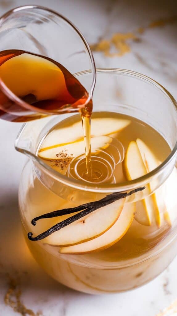 Pear nectar adds natural sweetness and body, balancing the dryness of prosecco. The vanilla bean’s oils subtly infuse the sangria with warmth, while nutmeg adds depth and complexity without overpowering the pear. The carbonation from the prosecco lifts the flavors, making it feel bright and fresh.