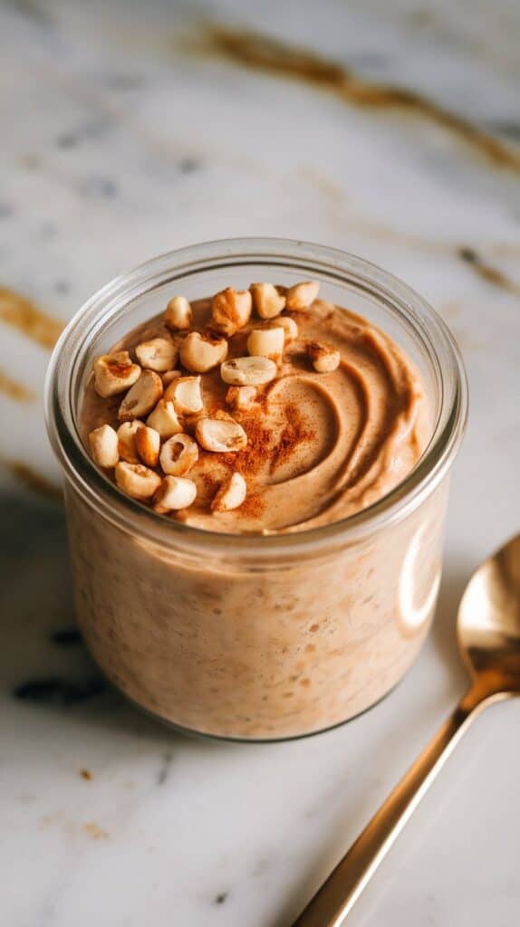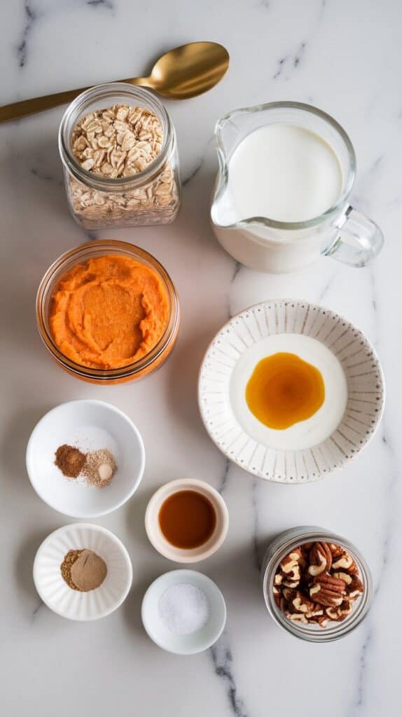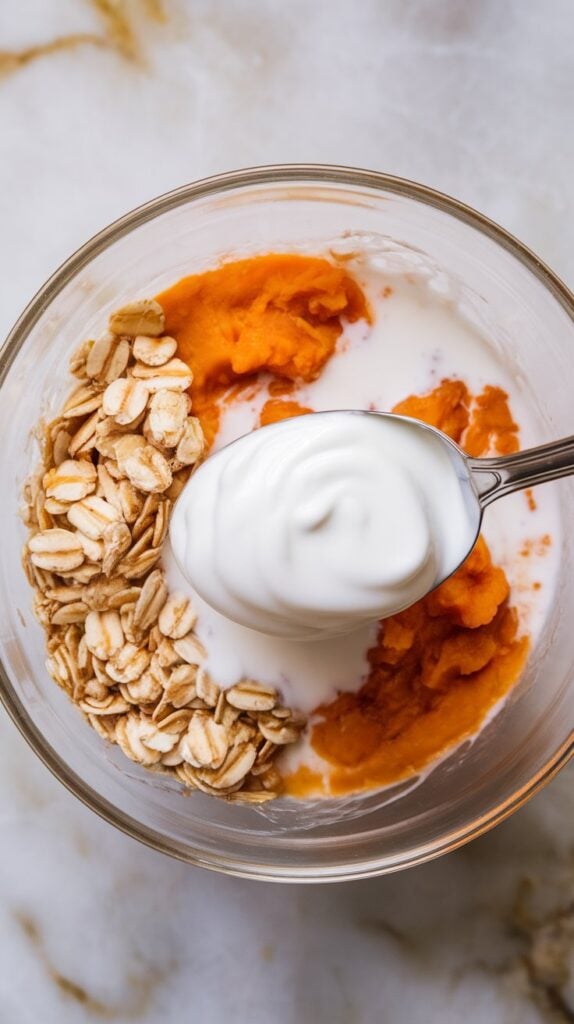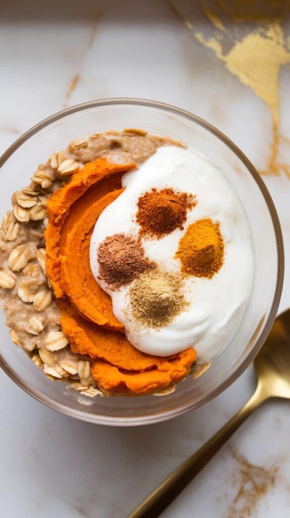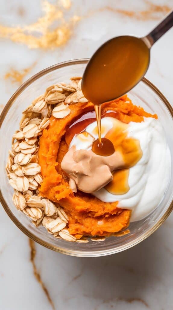 Sweet potato brings natural sweetness and creaminess. The oats soak up liquid overnight, softening without cooking. Greek yogurt adds protein and tang. Spices like cinnamon and ginger boost flavor without needing extra sugar. Almond butter adds healthy fats and richness that keeps you full.