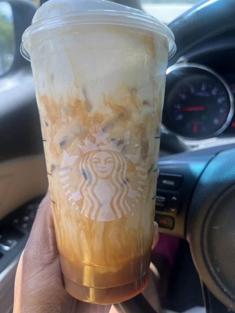 This drink is a delightful mix of brown sugar, oat milk, and espresso, topped with salted caramel cold foam and a caramel drizzle.