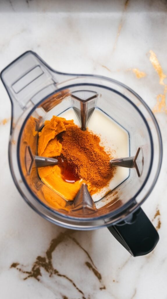 In a blender, combine 3 tbsp pumpkin purée, 3 tbsp maple syrup, 1 tsp pumpkin pie spice, 1 tsp vanilla extract, and 1 cup milk. Blend until smooth and creamy.