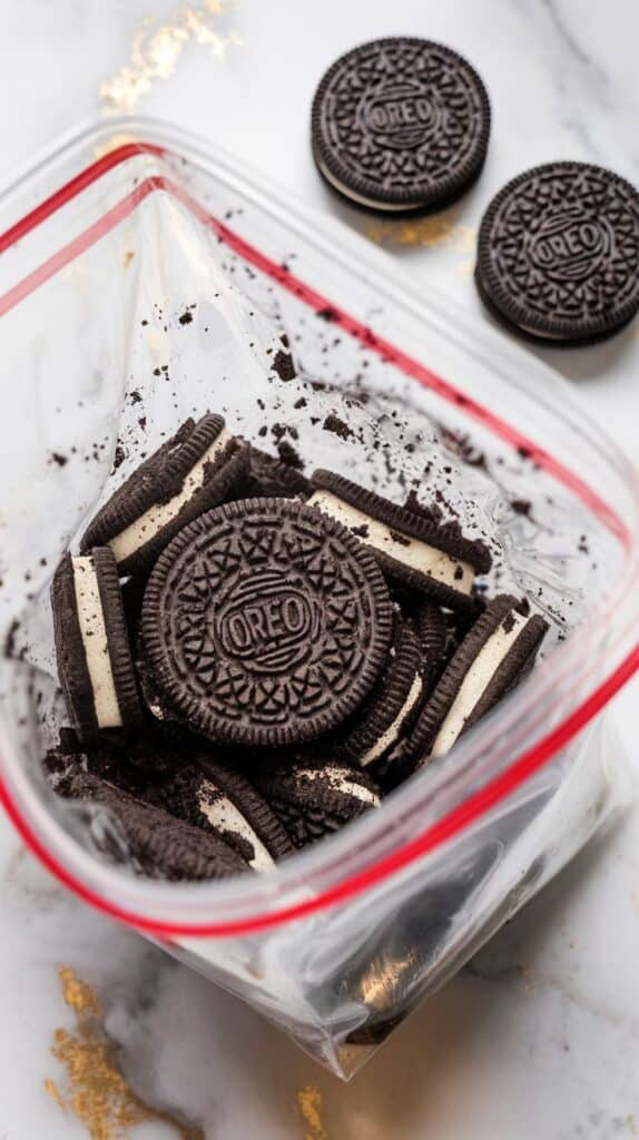Place 4 Oreos in a ziplock bag and crush them with a rolling pin. Set 2 crushed cookies aside for topping.