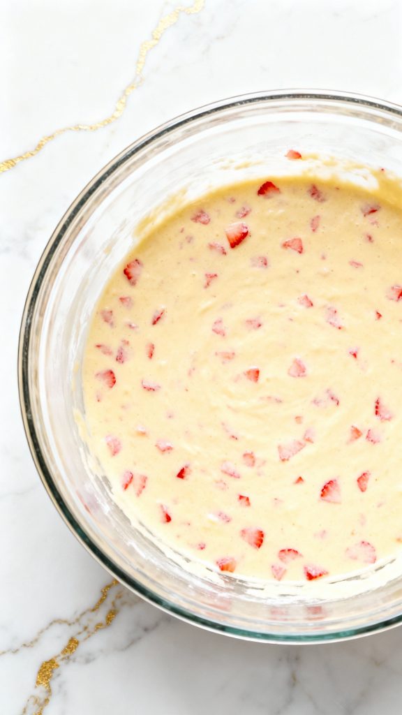 Gently fold in ¾ cup finely diced strawberries using a spatula.