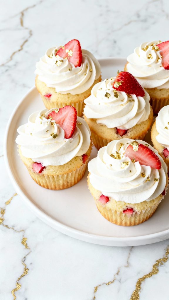 Pipe or spread frosting on each cooled cupcake. Garnish with strawberry slices and gold sprinkles if you like.