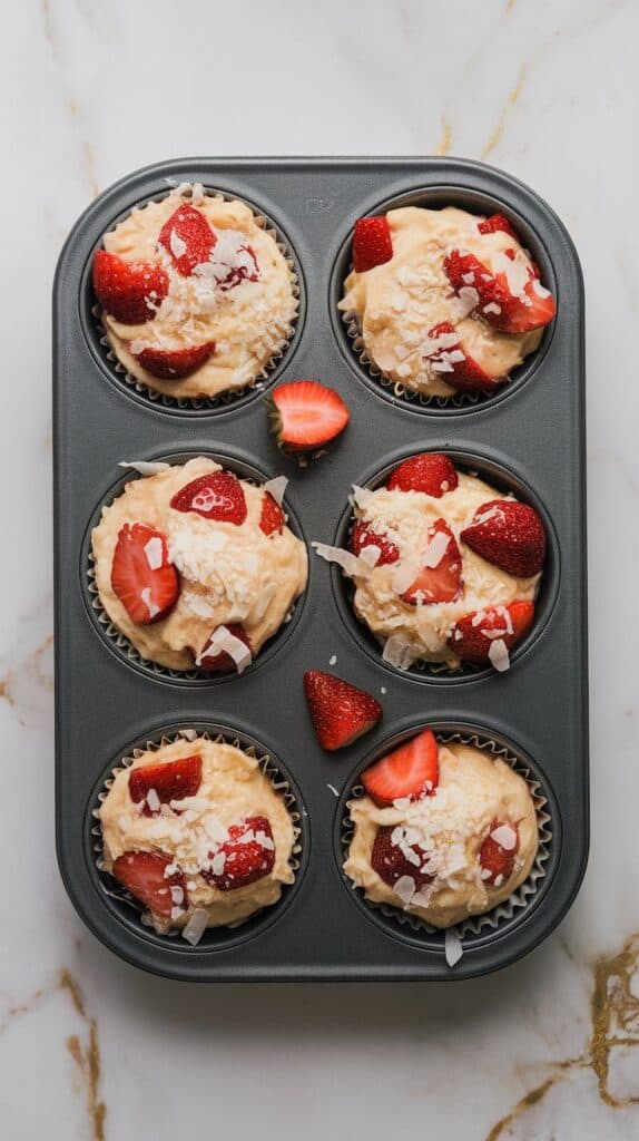 - Shredded coconut adds texture and soaks up moisture, helping the muffins hold their shape.