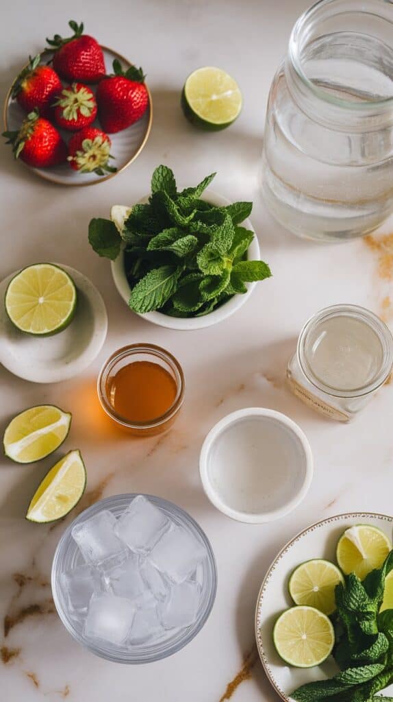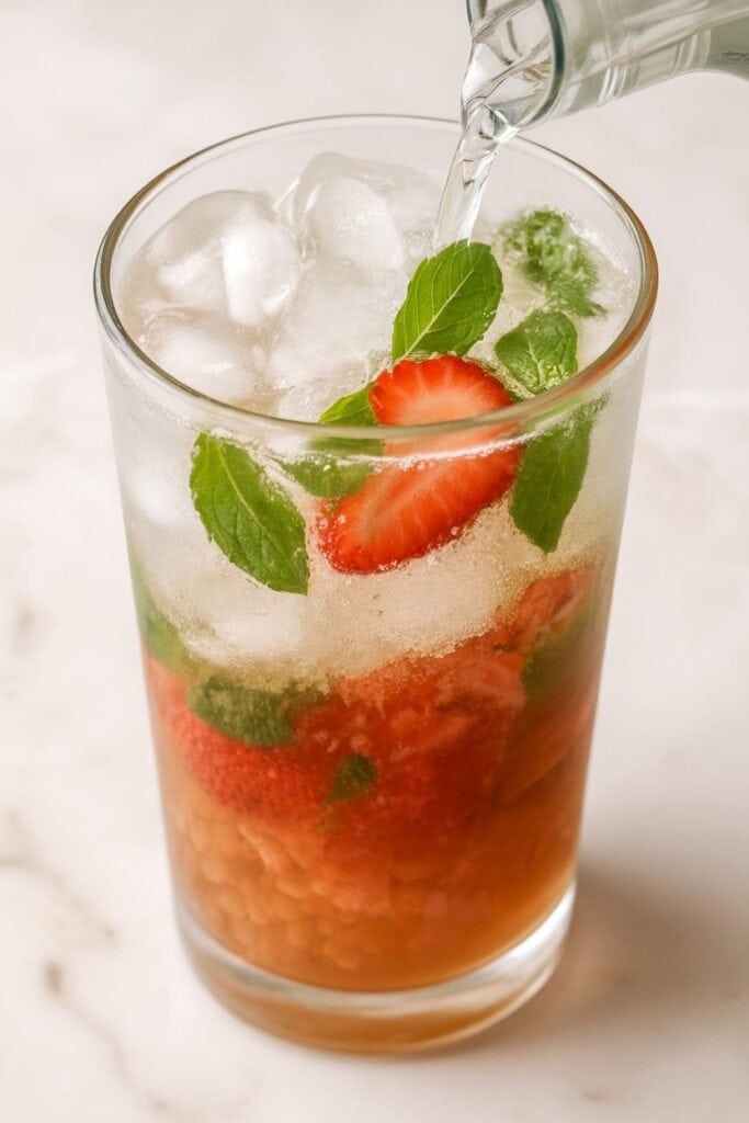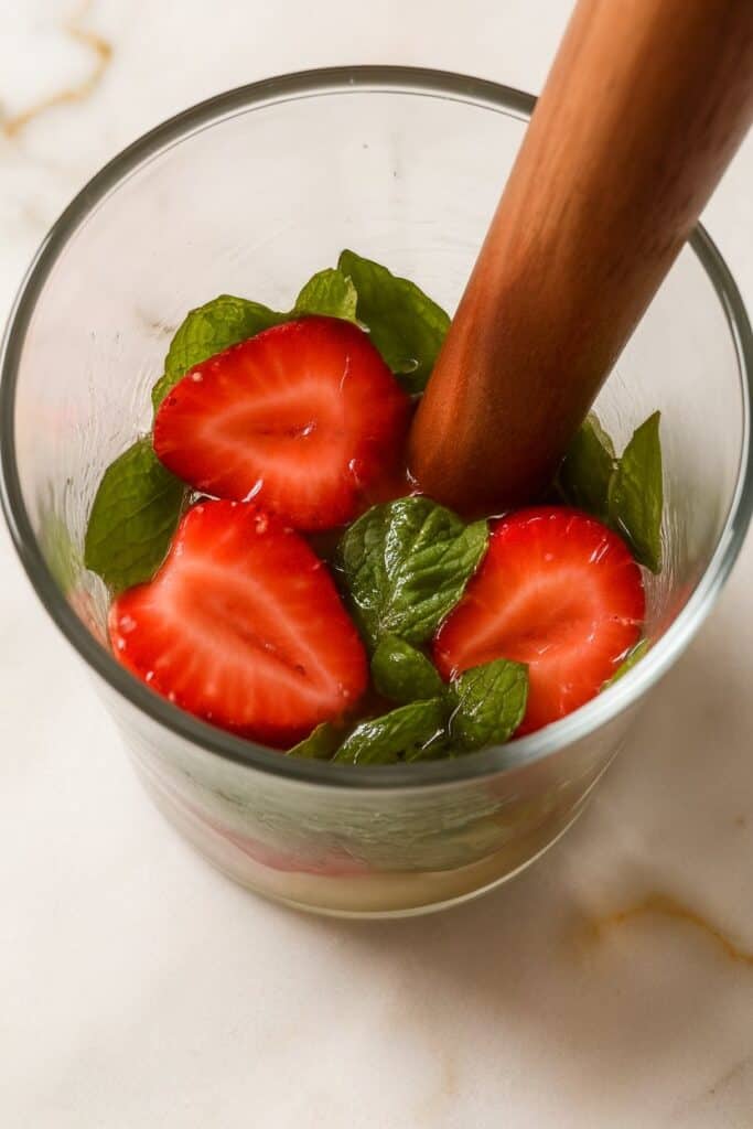 In a tall glass, add 4 sliced strawberries, 8-10 fresh mint leaves, and 1 tablespoon of fresh lime juice. Gently muddle everything together to release the flavors.