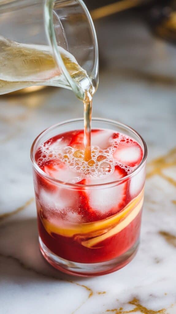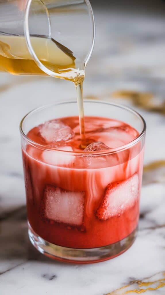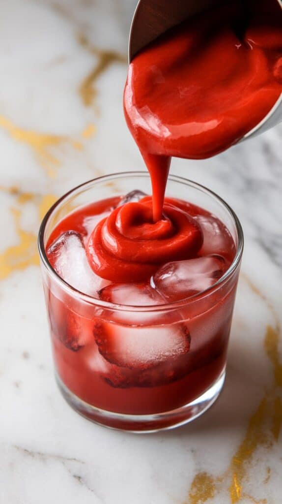 Spoon or pour about 2 tablespoons of the strawberry purée into the bottom of the glass, over the ice.