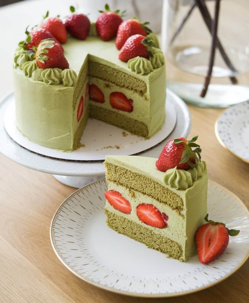 a matcha or green tea flavored sponge cake, adorned with a creamy green frosting and topped with fresh strawberries
