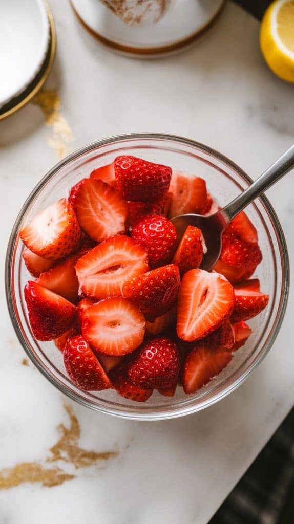 Mix sliced strawberries with sugar and lemon juice, letting them macerate.