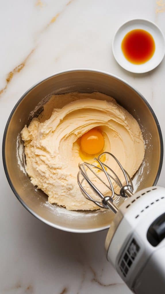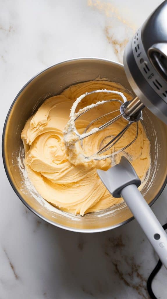 a mixing bowl filled with softened butter and granulated sugar, whipped into a light and fluffy texture with an electric mixer.