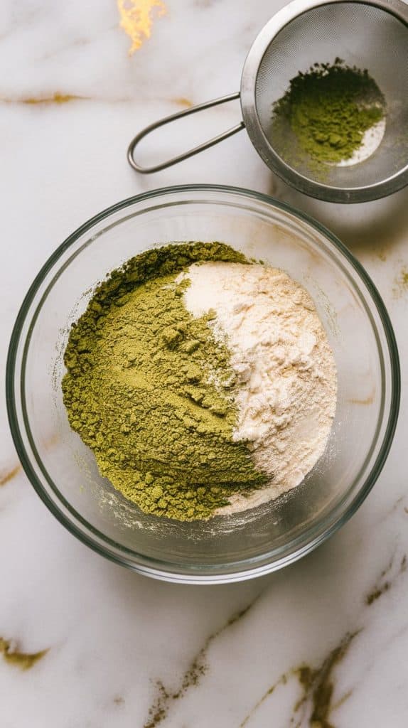 a mixing bowl with finely sifted matcha powder, all-purpose flour, baking powder, and salt, showing a light, fluffy texture