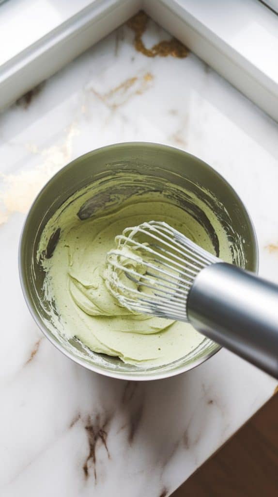 a mixing bowl with matcha whipped cream, soft peaks forming