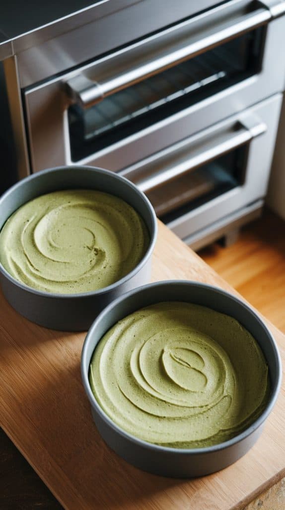 two cake pans filled with smooth, green matcha cake batter, ready to be placed into the oven