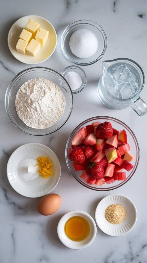 In a separate bowl, combine sliced strawberries, sliced rhubarb, sugar, cornstarch, vanilla, and lemon zest. Toss gently to coat.