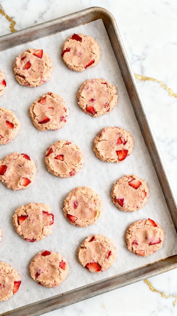 Using cold butter creates steam while baking, which helps the cookies puff up slightly and get that soft, biscuit-like texture. The heavy cream adds richness and moisture, while the strawberries release just enough juice to sweeten the dough without making it soggy.