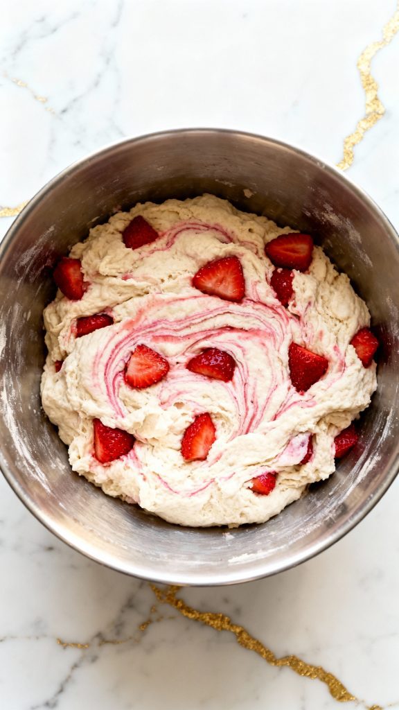Gently fold in the macerated strawberries (and their juices) into the dough. It’ll be soft and slightly sticky.