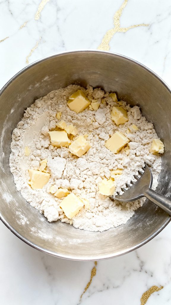 Add ½ cup cold, diced unsalted butter to the dry ingredients. Use your fingers or a pastry cutter to work it in until the mix looks like coarse crumbs.