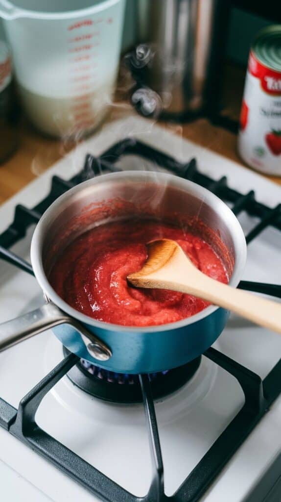 In a small saucepan, combine 4-5 fresh strawberries (hulled and sliced) and 1 tablespoon of sugar. Cook over medium heat until the strawberries break down and become soft (about 5 minutes). Blend until smooth, then set aside.