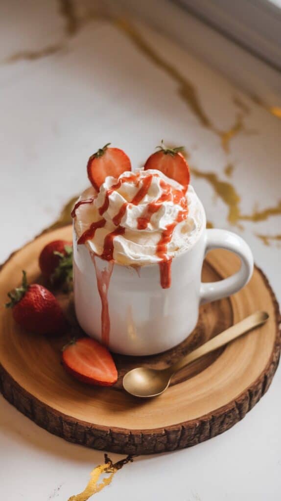 Top your latte with whipped cream, fresh strawberry slices, and a drizzle of strawberry syrup for that strawberry shortcake vibe. Serve immediately and enjoy!