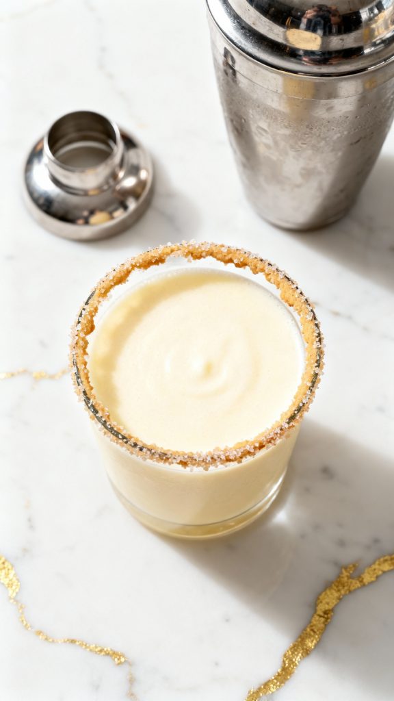 Strain the drink into your sugar-rimmed glass. It should look smooth and creamy.