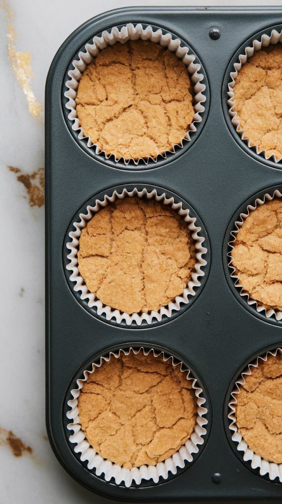In a small bowl, combine 1 cup graham cracker crumbs, 3 tbsp melted butter, and 2 tbsp brown sugar. Mix until it feels like wet sand. Press evenly into the bottom of 6 cupcake liners in a muffin tin.