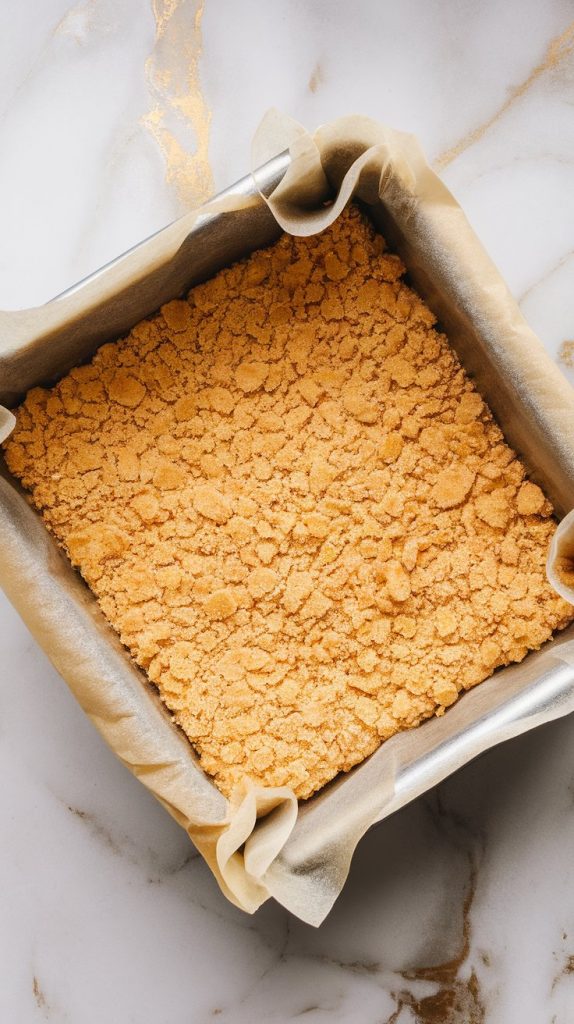 In a medium bowl, mix 1 ½ cups graham cracker crumbs, ¼ cup granulated sugar, and 6 tbsp melted butter until it feels like wet sand. Press it into a parchment-lined 9×9 pan and smooth it down evenly with the bottom of a glass.
