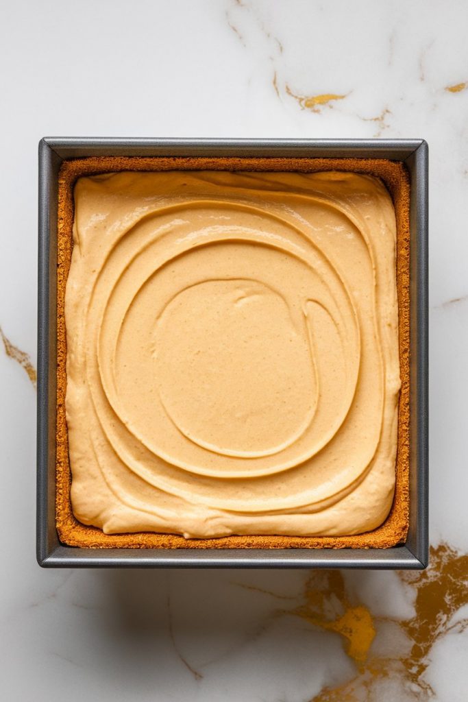 Ultra close-up of thick sweet potato cheesecake batter being poured and smoothed over the graham cracker crust in a square pan using a rubber spatula. On white marble counters with hints of gold, taken with an iPhone 15 Pro, top-down shot used by recipe bloggers.
