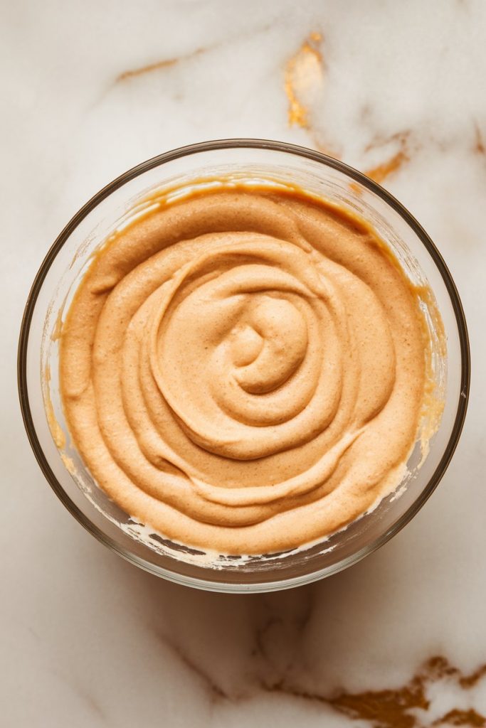 In a large bowl, beat 8 oz softened cream cheese with ½ cup brown sugar until fluffy. Add 1 cup mashed sweet potato and beat until smooth. Add 2 eggs, 1 tsp vanilla extract, ½ tsp cinnamon, ¼ tsp nutmeg, and ¼ cup sour cream. Mix just until combined.