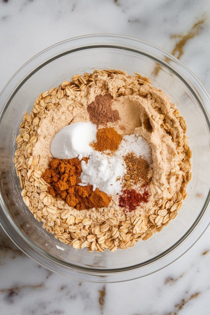 In another bowl, combine 1 cup rolled oats, 1 cup all-purpose flour, ½ cup brown sugar, 1 tsp baking powder, ½ tsp baking soda, ½ tsp salt, 1 tsp ground cinnamon, and ½ tsp ground nutmeg.