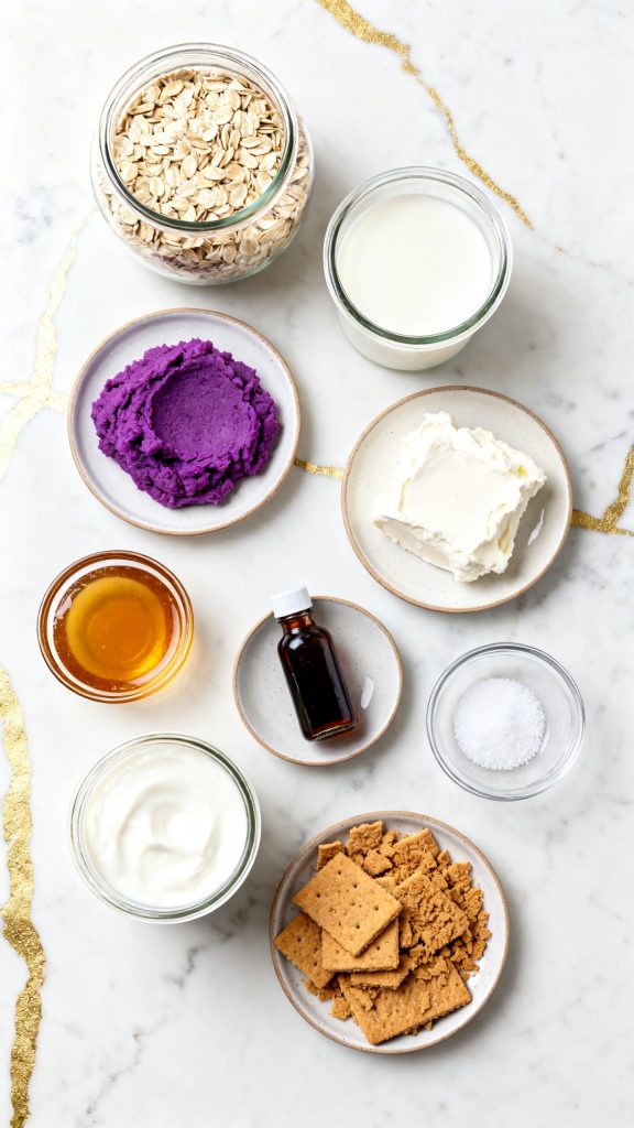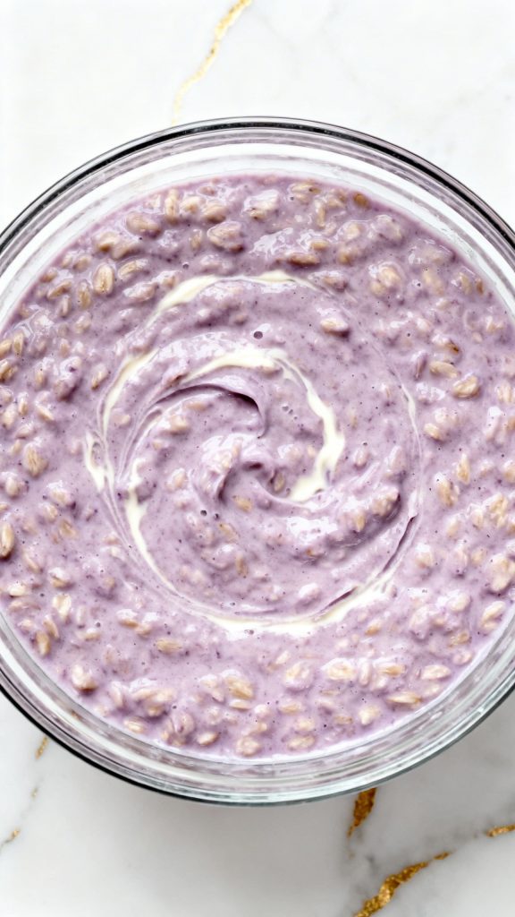 Oats absorb liquid overnight, which softens them without cooking. The ube adds natural starch and flavor, making the mixture thicker. Cream cheese adds fat, which gives that rich cheesecake texture. The balance of liquid and oats is what makes it creamy instead of dry.