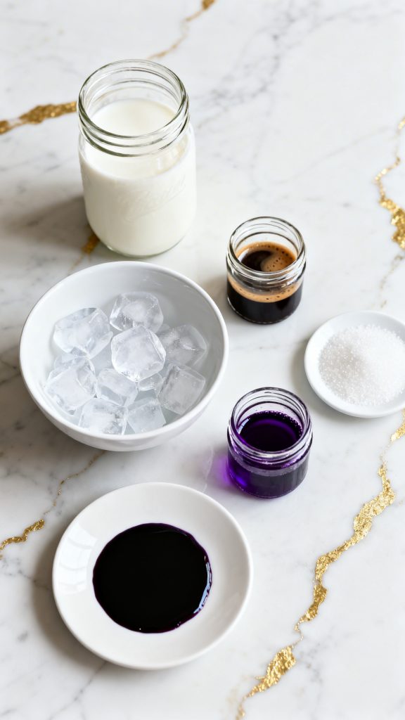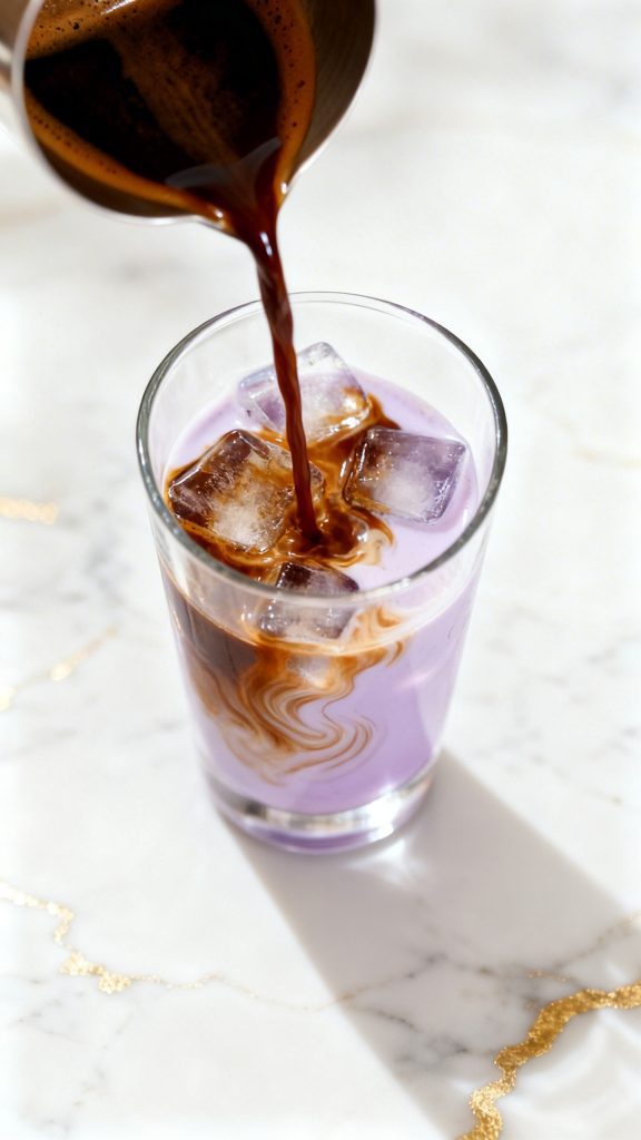 Ube extract adds both flavor and color without changing the texture much. Milk helps balance the strong coffee, while sugar smooths out bitterness. When you pour coffee over ice slowly, it creates layers because of density differences—pretty and functional.