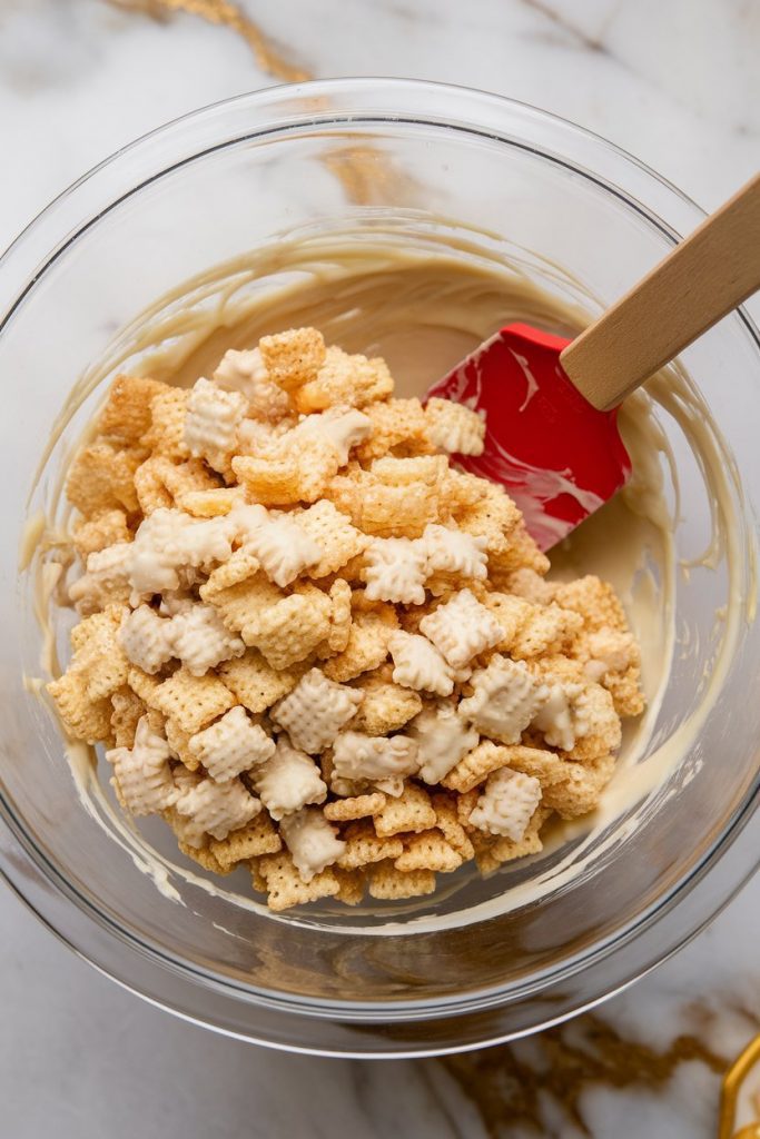 Add 6 cups Rice Chex cereal to a large mixing bowl. Pour the warm cream cheese chocolate mixture over the cereal. Use a spatula to gently fold it all together until evenly coated.