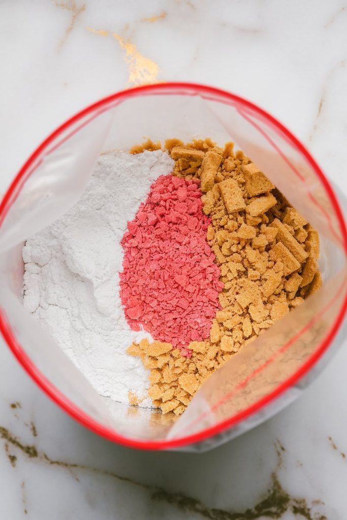 Add 1/2 cup powdered sugar, 1/2 cup powdered freeze-dried strawberries, and 1/2 cup crushed graham crackers to a gallon-size zip-top bag or large bowl with lid. Shake or stir until mixed well.