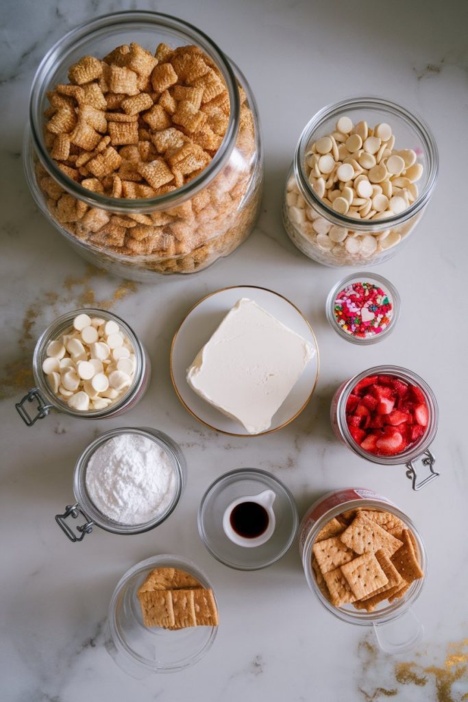 The cream cheese melts into the white chocolate, giving it a tangy richness that mimics cheesecake flavor. The freeze-dried strawberries add intense flavor without moisture, so the cereal stays crisp. The powdered sugar and graham cracker coating locks everything in place and gives that classic “puppy chow” texture.