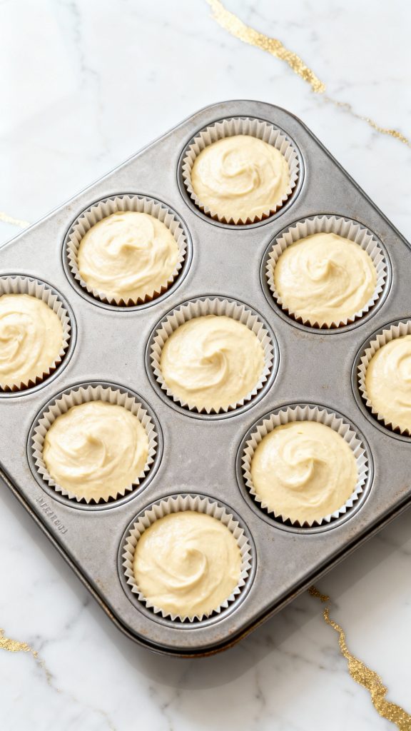 Line a cupcake pan with 9 liners. Divide batter evenly into each cup, filling about 3/4 full. Bake at 350°F (175°C) for 18–20 minutes or until a toothpick comes out clean.