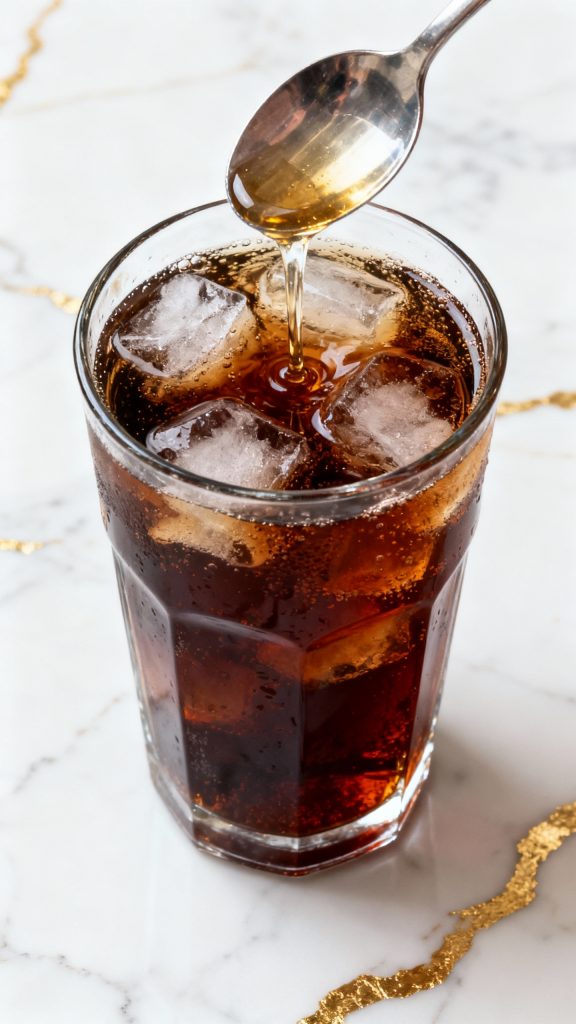 Drizzle 1½ tablespoons vanilla syrup and 1 tablespoon coconut syrup right into the soda. The syrups slowly sink and swirl together, adding a warm vanilla smell and a light tropical note without stirring yet.