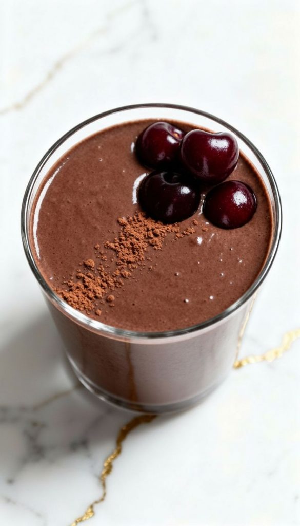 Pour the smoothie into a glass or bowl and top with a few frozen cherries and a dusting of cocoa powder.