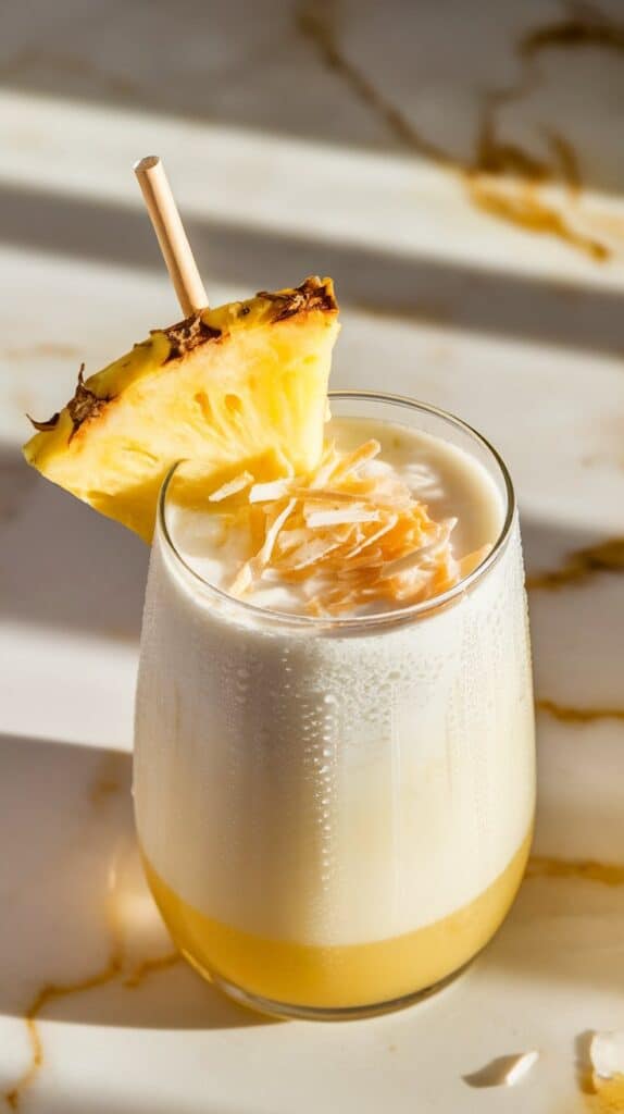 - Optional garnish: pineapple wedge, shredded coconut, paper straw