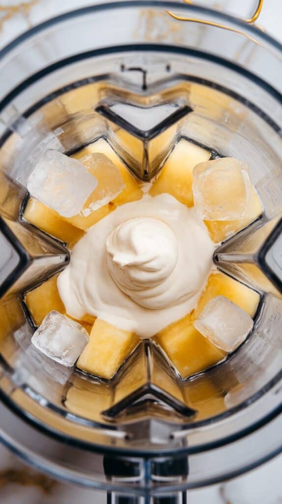 Add 1/2 cup of frozen pineapple chunks to the blender. They help thicken the drink and keep it nice and cold.