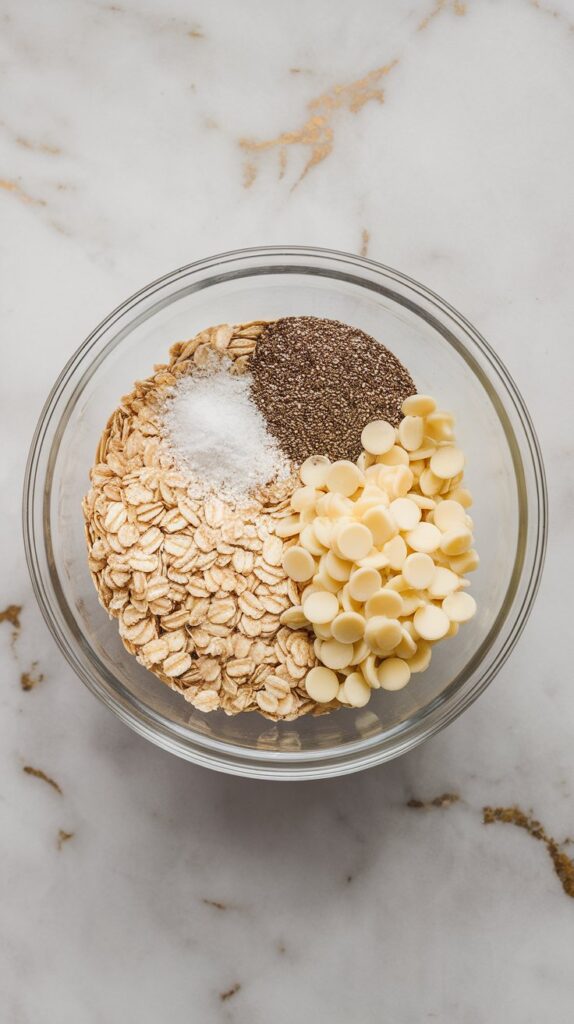 In a medium mixing bowl, add 1 cup rolled oats, 1 tbsp chia seeds, 2 tbsp white chocolate chips, and a pinch of salt. Stir together gently to combine.