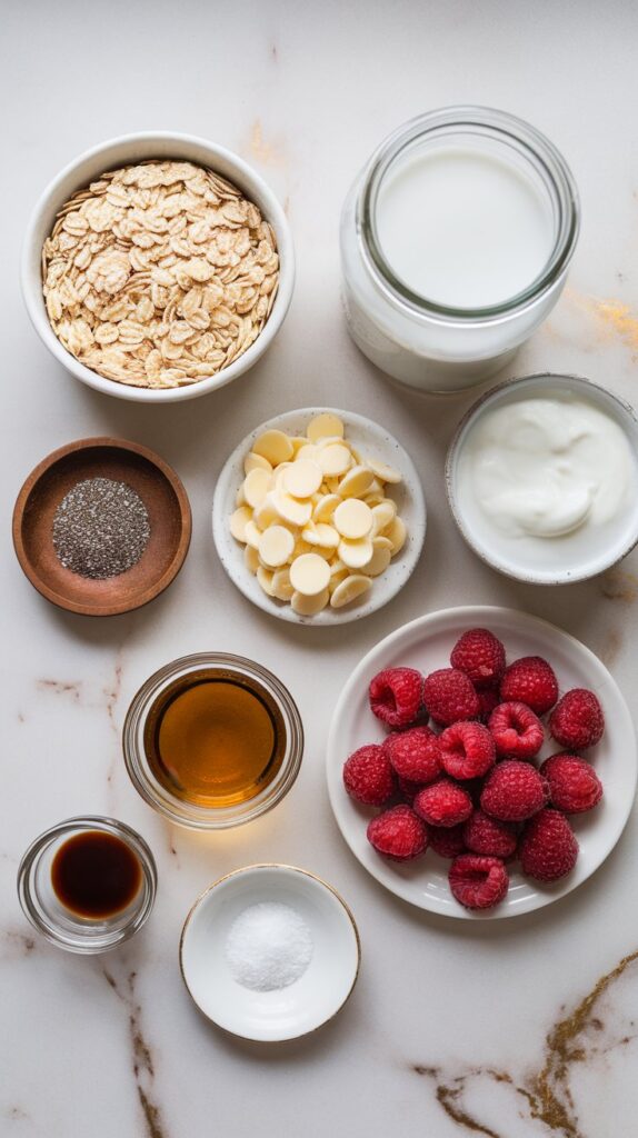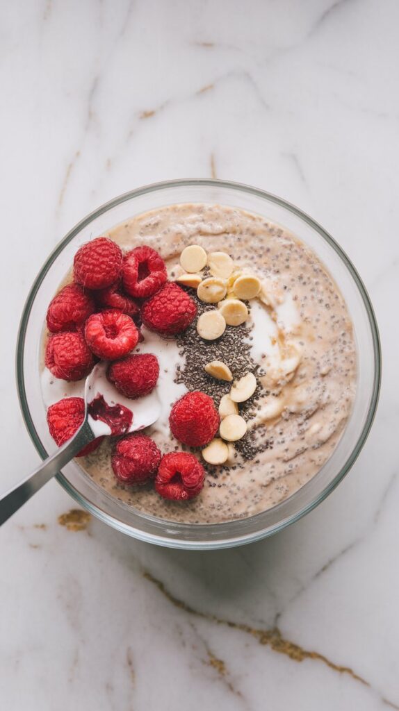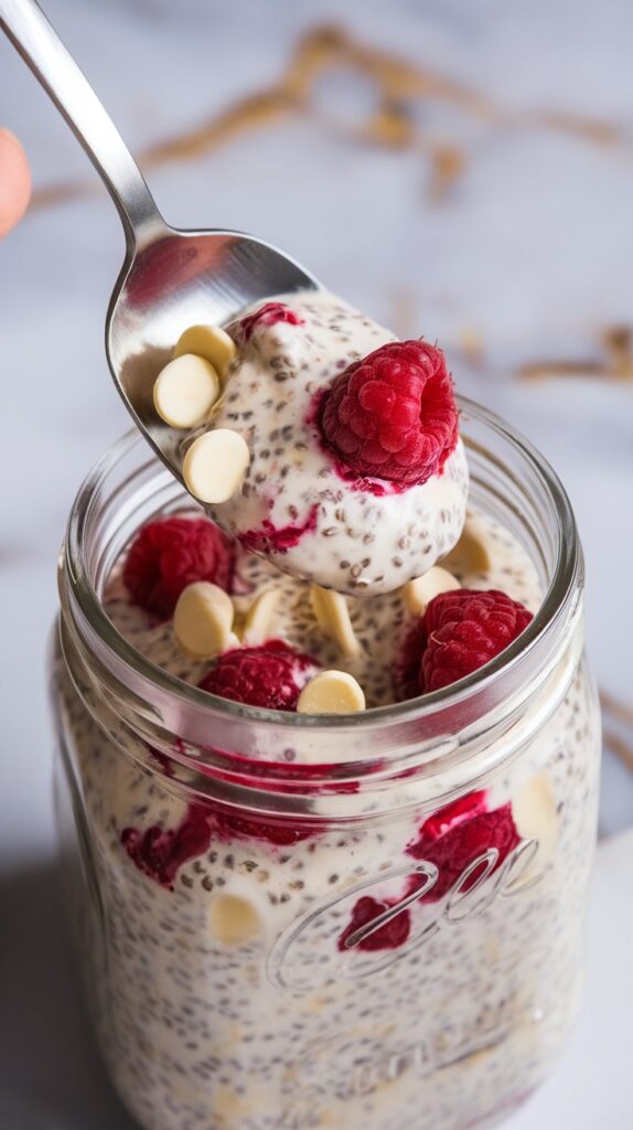 Oats absorb liquid overnight, softening up without any heat. The chia seeds help thicken everything with their natural gelling power. The acid in raspberries breaks down just enough to add flavor, and white chocolate slowly melts in the creamy mix, giving it that dessert vibe.