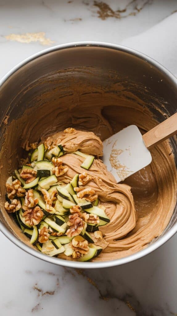Instructions: Gradually add the dry ingredients to the wet mixture, stirring gently. Fold in the shredded zucchini and walnuts.