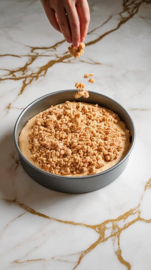 Instructions: Pour the batter into the prepared pan and sprinkle the crumble topping evenly over the surface.